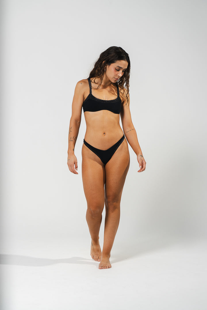 Top básico con combinación de dos textiles, uno con textura afelpada y otra con brillo y forrado con nylon super suave.